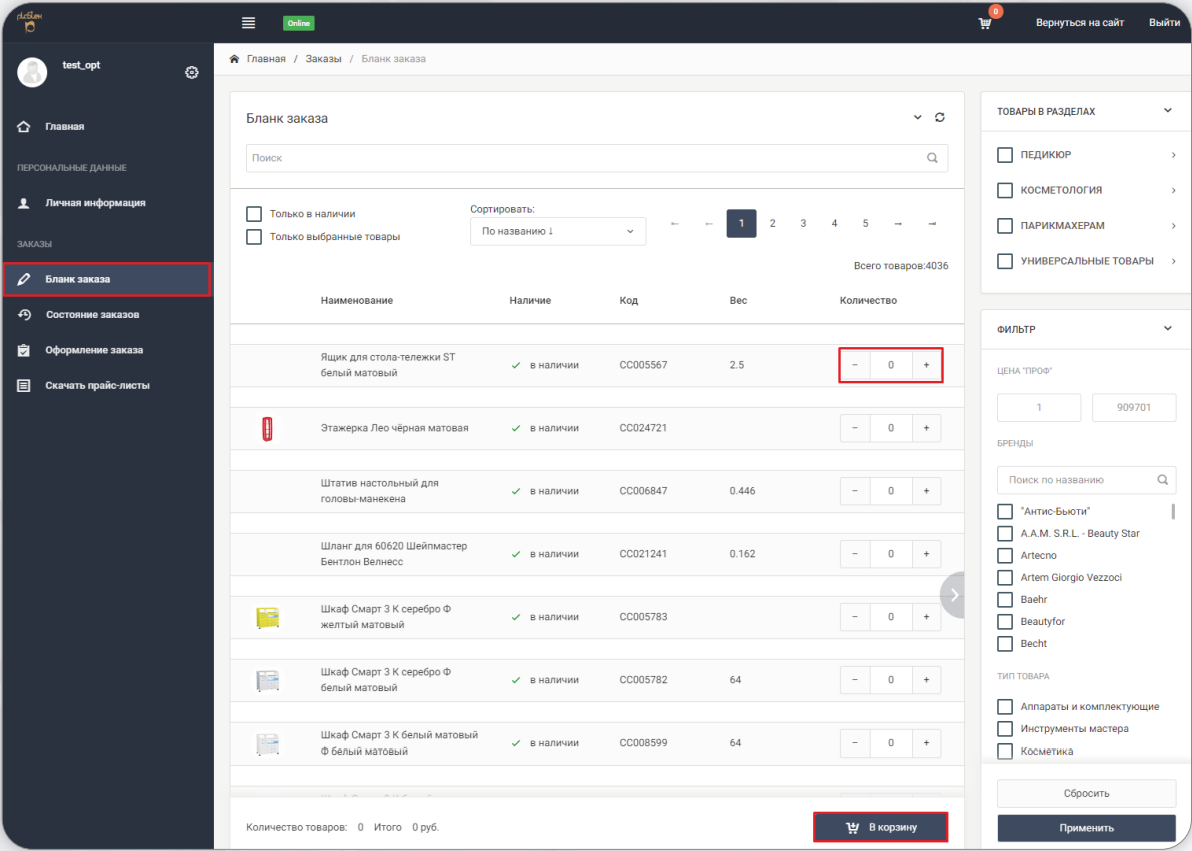 3. На вкладке «Бланк заказа» вы можете выбрать интересующие товары для покупки, справа на странице представлены фильтры для поиска по различным критериям.